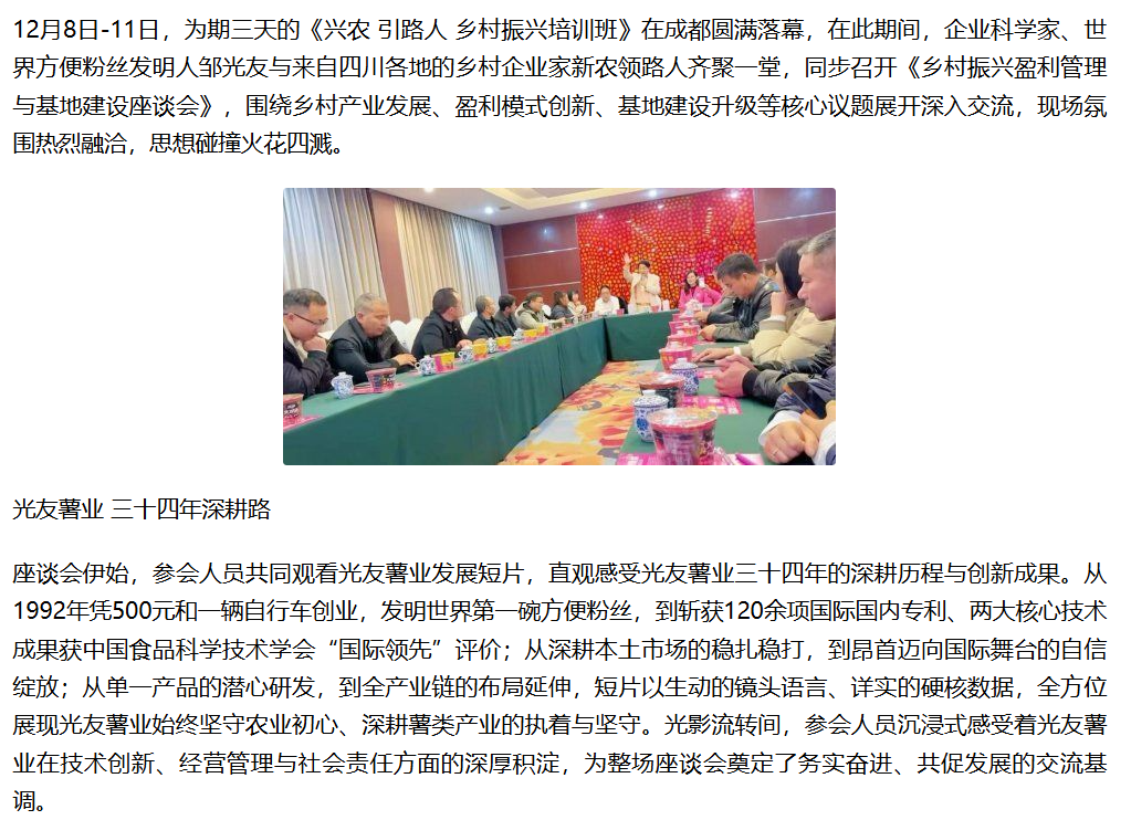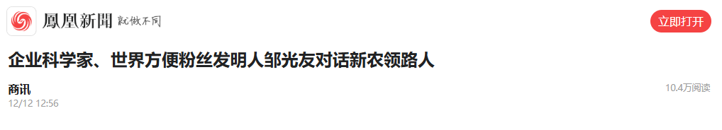 轉(zhuǎn)載鳳凰網(wǎng) -企業(yè)科學(xué)家、世界方便粉絲發(fā)明人鄒光友對話新農(nóng)領(lǐng)路人